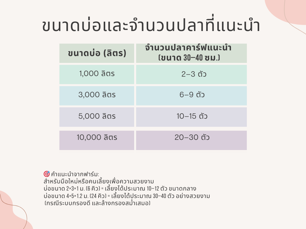 - 1 ลูกบาศก์เมตร (1,000 ลิตร) = แนะนำเลี้ยง 2–3 ตัว ขนาด 30–40 ซม.